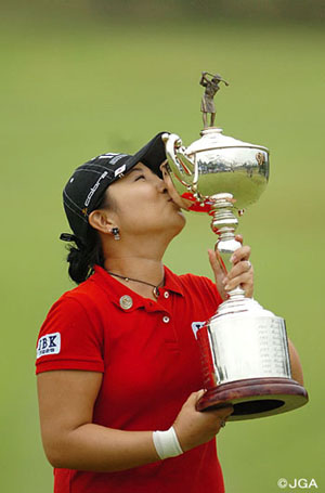 優勝トロフィーにキスをする張晶 写真提供:(財)日本ゴルフ協会 |