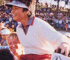 大迫たつ子(通算45勝) 米ツアーの賞金女王を祝福される岡本綾子(1987年 )