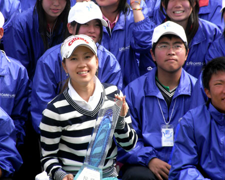 ライフカードレディスゴルフトーナメントで初Vの上田桃子。 ボランティアに囲まれて。